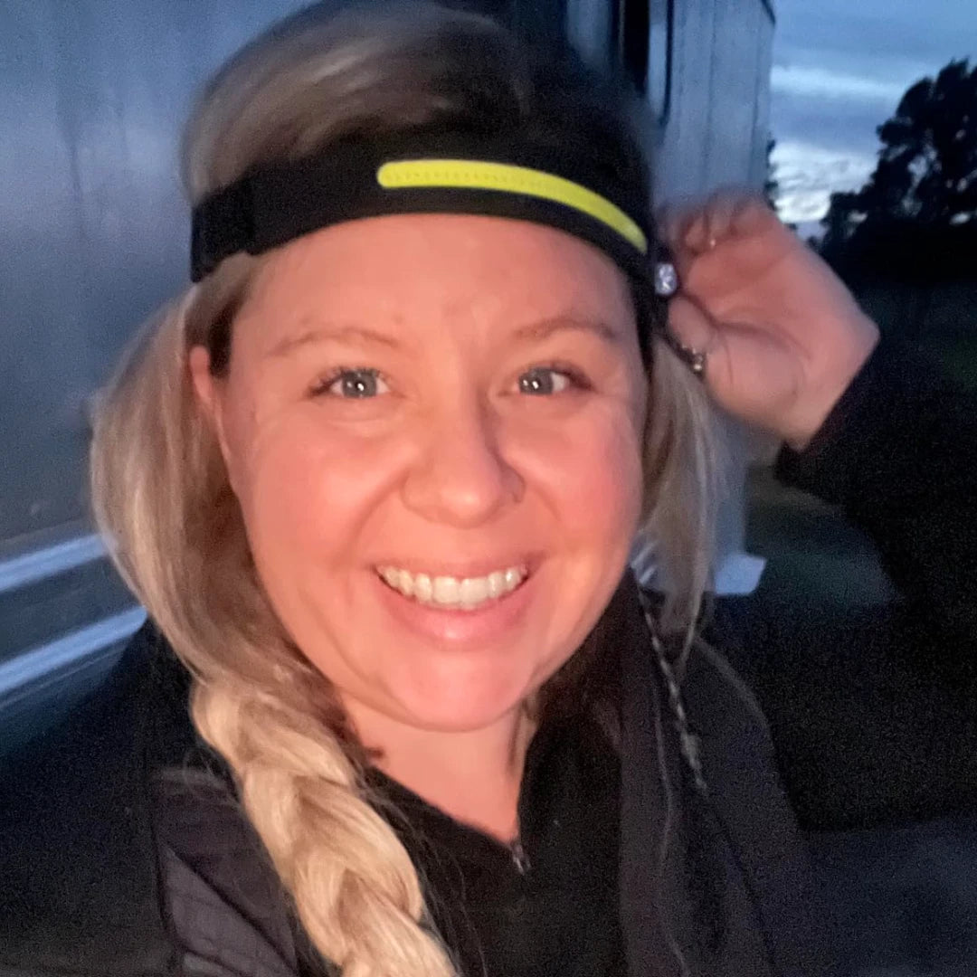 La vincha es regulable y liviana. Se usa cómoda en cabeza, sobre casco o gorra sin moverse.